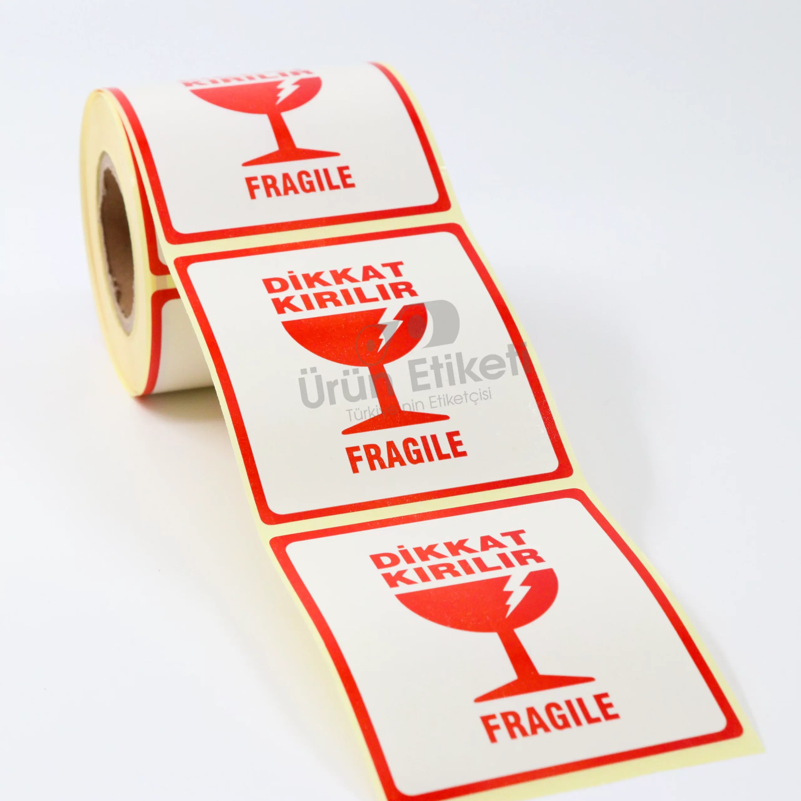 Dikkat Kırılır Etiketi(Fragile Label) Genellikle kolilerin üzerine yapıştırmak için kullanılır. Kolinin ya da paketin hasar görmesi durumunda içindeki ürünün kırılabileceğini belirtir. Ürün standart tutkallı ve kuşe türünde bir etikettir kolilere rahatlıkla yapıştırabilirsiniz. Zorlama olmadan kendi kendine çıkmaz. Bir çok yüzeye yapıştırabilirsiniz.